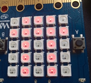 from microbit import * mycolor = [3, 1, 1] display.show(Image.ALL_CLOCKS, color=mycolor, loop=True, delay=500)